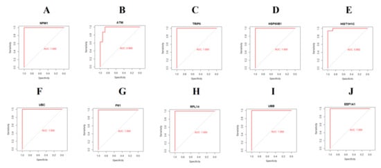 Receiver operating characteristic (ROC) curves and area under the curve (AUC) statistics to evaluate the diagnostic efficiency of the hub genes in GSE23766. (A) NPM1 (B) ATM (C) TRIP6 (D) HSP90B1 (E) HIST1H1C (F) UBC (G) FN1 (H) RPL14 (I) UBB (J) EEF1A1.