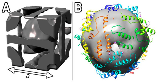 (A) Unit cell of the obtained cubic crystal lattice; (B) the 1DPS crystal structure [15] fitted into obtained CryoEM map. The smaller isosurface threshold of CryoEM map was chosen to reveal pores in Dps molecule.