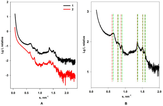 Experimental small-angle scattering curve of Dps–DNA co-crystals in solution at different buffers: 1 = pH 7.5, 10 mM of Tris-HCl, 100 mM of NaCl, and 0.5 mM of EDTA; 2 = pH 8.0, 50 mM of Tris-HCl, 50 mM of NaCl, and 0.5 mM of EDTA (A). The peak positions marked with lines depending on the type of crystal lattice at buffer 1 used in the present study (B). Red lines correspond to triclinic crystal lattice system (first peak corresponds to hkl = 001), and green lines correspond to cubic crystal lattice system (first peak corresponds to hkl = 110).