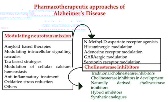 Recognized as a multifactorial condition that involves multiple biological mechanisms, the etiology of Alzheimer’s disease is not completely understood, and no safe and effective compound to prevent, stop, or reverse its evolution is currently available. Figure 2 schematically shows some therapeutic strategies that over time have been investigated for the treatment of AD. Existing AD therapies focused on agents that aimed to increase the cerebral acetylcholine levels by facilitating cholinergic neurotransmission through inhibiting cholinesterase. These compounds, known as cholinesterase inhibitors, offer a viable target across key sign domains of Alzheimer’s disease [,,,].