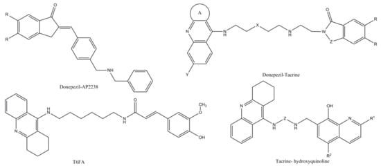 - Girek, M.; Szymański, P. Tacrine hybrids as multi-target-directed ligands in Alzheimer’s disease: Influence of chemical structures on biological activities. Chem. Pap. 2019, 73, 269–289. [Google Scholar] [CrossRef]