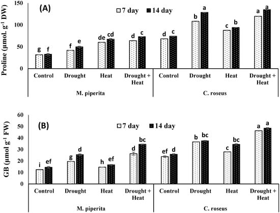 The present findings confirm that both M. piperita and C. roseus show typical growth responses to abiotic stress, including decreases in plant height and in fresh and dry weight, and that the effects are most pronounced in seedlings exposed to a combined heat and drought stress (Table 1 and Table 2). The maximum declines in height and fresh and dry weight in the shoot were 28.99, 44.88, and 45.45% in M. piperita and 48.63, 33.68, and 42.58% in C. roseus following exposure to a combined heat and drought stress. No significant differences were observed in the root fresh and dry weight in the stressed plants when compared to control plants (Table 1 and Table 2).
