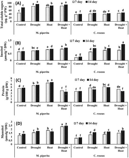 Effect of drought, heat and drought + heat stress on the total soluble sugars (A), inositol (B), protein (C) and mannitol (D) of M. piperita and C. roseus after seven and fourteen days of stress exposure. Mean (±SE) of five values is presented and values denoted by different letters are significantly different at p < 0.05.