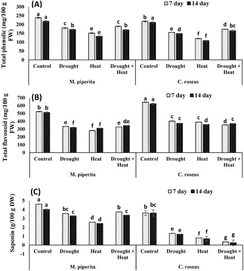 Effect of drought, heat and drought + heat stress on the total phenols (A), total flavonoids (B) and saponins (C) in M. piperita and C. roseus after seven and fourteen days of stress exposure. Mean (±SE) of five values is presented and values denoted by different letters are significantly different at p < 0.05.
