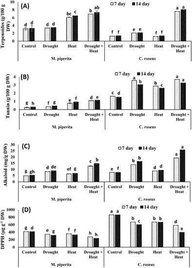 Effect of drought, heat and drought + heat stress on the terpenoids (A), tannins (B), alkaloids (C) and DPPH scavenging activities (D) in M. piperita and C. roseus after seven and fourteen days of stress exposure. Mean (±SE) of five values is presented and values denoted by different letters are significantly different at p < 0.05.
