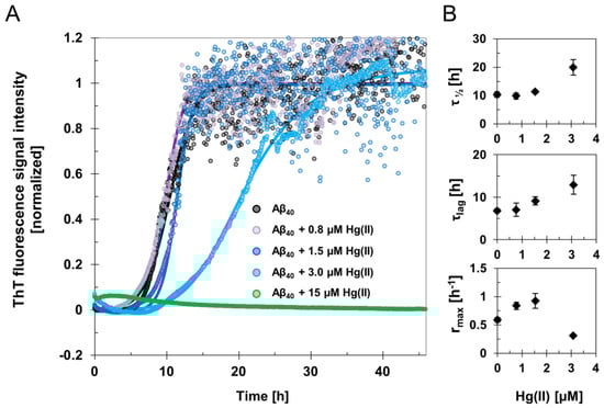 Amyloid fibril formation monitored by ThT aggregation kinetics assay. (A) ThT fluorescence signal intensity traces of averaged and normalized data from samples with 15 μM Aβ40 peptides in 20 mM sodium phosphate buffer pH 7.4 incubated in the absence and presence of 0.8–15 μM Hg(II) ions at +37 °C under quiescent conditions. The average of four replicates is presented as circles, and the average fit is shown as a solid line for each Hg(II) ion concentration. (B) Phenomenological parameters were extracted from sigmoidal curve fitting of the experimental ThT data in (A) using Equation (1), yielding the aggregation halftime τ½, lag time τlag, and maximum growth rate rmax. The error bars in (B) represent the standard deviation of four replicates.