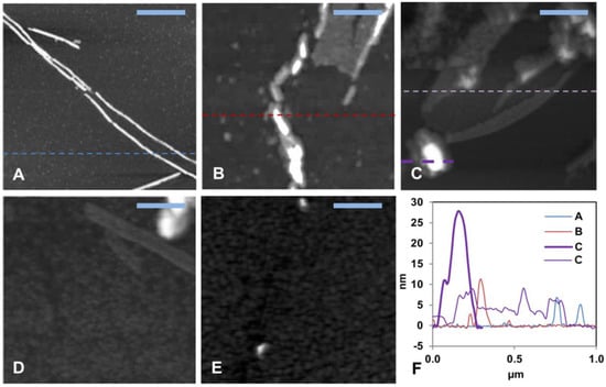 AFM images (Figure 2 and Figure S3) were recorded for the aggregation products present at the end of the ThT kinetics experiments. First, 15 µM Aβ40 alone formed typical amyloid fibrils with a height of about 10 nm (Figure 2A and Figure S3A), which is a typical size for Aβ fibrils formed in vitro [,]. The aggregates of 15 µM Aβ40 formed in the presence of low concentrations (0.8, 1.5, and 3.0 µM) of HgCl2 displayed shorter fibril-like structures (Figure 2B–D and Figure S3B–D). No amyloid aggregates were observed when the Aβ40 sample was incubated together with equimolar amounts of HgCl2 (Figure 2E and Figure S3E). These results are consistent with the concentration-dependent inhibitory effect of Hg(II) ions on Aβ fibrillization observed with the ThT assays (Figure 1).