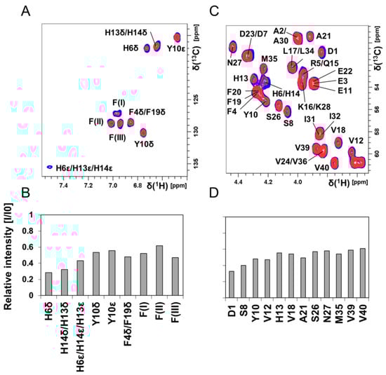 Figure 4 shows 2D NMR 1H–13C-HSQC spectra for aromatic (Figure 4A) and Cα–H (Figure 4C) crosspeaks of 84 μM unstructured 13C-15N–Aβ40 peptides in phosphate buffer, before and after addition of 80 μM Hg(II) ions. Again, crosspeaks corresponding to N-terminal Aβ40 residues display the largest intensity loss (Figure 4B,D). Although these NMR observations give no direct information about the metal-binding coordination, the observed loss of NMR signal for specific residues is likely caused by intermediate chemical exchange on the NMR time-scale between a free and a metal-bound state of the Aβ40 peptide, similar to the effect induced by Zn(II) ions []. The histidine residues His6, His13, and His14 are markedly affected by the Hg(II) ions (Figure 4B), and might be the main metal-binding ligands. The general loss of Aβ40 crosspeak signal intensity induced by addition of HgCl2 (Figure 3B, Figure 4 and Figure S4D) indicates that Hg(II) ions promote formation of large Aβ aggregates, where some of them are too large to be observed with HSQC NMR and some simply precipitate out of the solution. Thus, the NMR data presented in Figure 3 and Figure 4 mainly stem from interactions between Hg(II) ions and non-aggregated Aβ40 monomers.