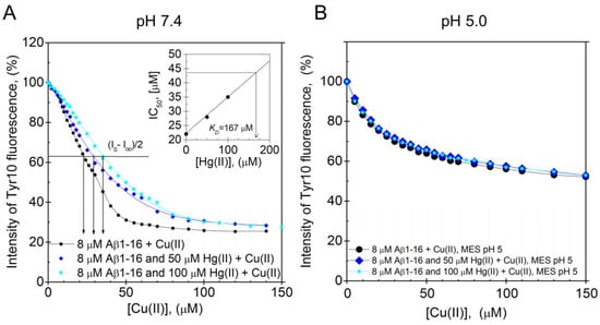 The Aβ16 peptide was used to investigate the pH-dependence of the Hg(II)·Aβ binding affinity, as it is less prone to aggregate during measurements than full-length Aβ peptides. Because Cu(II) ions quench the intrinsic fluorescence of tyrosine residues, while Hg(II) ions do not, the Hg(II)·Aβ16 binding affinity was measured via Cu(II)·Hg(II) competition experiments. Figure 5A,B shows fluorescence quenching data for the Tyr10 residue of 8 µM Aβ16, obtained via stepwise additions of Cu(II) ions in the absence and presence of different concentrations of Hg(II) ions at either pH 7.4 or pH 5.0. The KDapp value for the Cu(II)·Aβ16 complex at pH 7.4 was estimated to be approximately 22 µM in the absence of Hg(II) ions. This value is somewhat higher than the previously reported KDapp values of around 0.5–3 µM, which might be due to different sample preparations and different experimental conditions during the measurements [,,]. When increasing concentrations of Hg(II) ions are present in the pH 7.4 samples, the titration curves are shifted towards weaker Cu(II) affinities, showing that the Hg(II) and Cu(II) ions compete for binding to the Aβ16 peptide (Figure 5A). The KDapp values for the Cu(II)·Aβ16 complex, obtained from the Cu(II) titration series in the presence of 0, 50, and 100 µM Hg(II) ions, are, respectively, 22, 28, and 35 µM. Plotting these KDapp values vs. the Hg(II) concentration (Figure 5A, insert) produced a straight line that was extrapolated to the point where KDapp is two times the KDapp value in absence of Hg(II) ions. At this point, the Hg(II) concentration, which was found to be 170 µM, should be approximately equal to the apparent KD for the Hg(II)·Aβ16 complex.