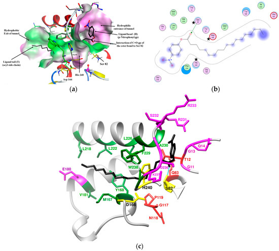 Figure 4. Binding of p-NPS (C18) (black color) to the tunnel binding site of LysB-D29 showing: (a) 3D shape of LysB-D29 active site, (b) 2D illustration of interacting residues of LysB-D29 active site with p-NPS ligand (generated by MOE®) (stars indicate catalytic triad residues of LysB-D29), (c) 3D illustration of interacting residues of LysB-D29 active site with p-NPS ligand: loops forming the hydrophilic opening (Loop-1 (G11 to Q14) and loop-5 (R231 to K237) in pink), helices forming the hydrophobic opening (α6 (M167 and Y168), α8 (V181), α10 (L218, I222, A225, L226, F229, A230), and loop-5 (W238) in green), oxyanion hole residues (T12 and Q83) and GNP residues (red), and H-bond between serine residue of LysB-D29 and the carbonyl group (C=O) of p-NPS ligand (cyan).