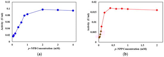 Figure 5. Rate of LysB-D29 catalyzed reaction with different concentrations of (a) p-NPB and (b) p-NPP. Twenty microliters of LysB-His6 enzymes were added to 180 µL of p-NPL and p-NPP, respectively (1 mM dissolved in 20 mM Tris-HCl, 100 mM NaCl, 0.1% Triton X-100, pH 8), the reaction mixture was incubated at 37 °C and the release of p-nitrophenol was recorded at 410 nm at 1 min intervals.