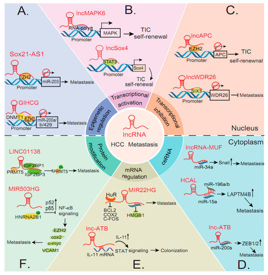 Several recent reviews focus on the emerging role of lncRNAs in HCC [6,7,8]. The main aspect of our review is to summarize the increasingly recognized functions of lncRNAs in HCC metastasis. We highlight a broad repertoire of functions and molecular mechanisms of lncRNAs at the epigenetic, transcriptional, and post-transcriptional levels in HCC metastasis. Moreover, we briefly elaborate on the current advances regarding the signaling pathways of lncRNAs in HCC metastasis and the role of lncRNAs in the multi-step process of HCC metastasis.