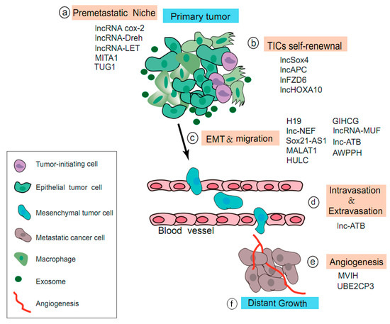 LncRNAs in the multi-step process of HCC metastasis. LncRNAs exert diverse regulatory roles in the multi-step metastasis of HCC, including (a) the pre-metastasis niche (e.g., lncRNA cox-2 and MITA1), (b) TIC self-renewal (e.g., lncSox4 and lncFZD6), (c) EMT and migration (e.g., H19 and Sox21-AS1), (d) intravasation and extravasation (e.g., lnc-ATB), (e) angiogenesis (e.g., H19 and Sox21-AS1), and (f) distant growth (e.g., MVIH and UBE2CP3).