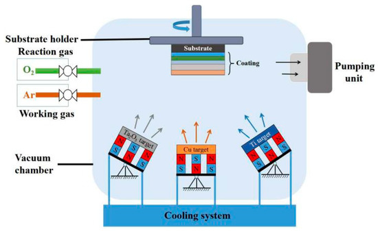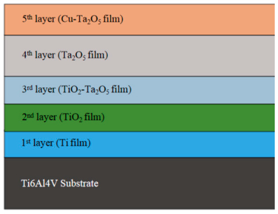 The structural diagram of Cu-MTa2O5 multilayer composite coating is presented in Figure 1. The first to the third layer of the composite coating is the intermediate transition layer, which is used to enhance the adhesion strength between the Ta2O5 coating and the Ti6Al4V substrate. The fourth layer, Ta2O5, and the fifth layer, Cu-Ta2O5, both are functional layers, which have functions of corrosion resistance and antibacterial effect respectively. Before depositing the coating, the Ti6Al4V substrate was successively ground with 240 to 2000 mesh SiC sandpaper, then polished for 10 min with 5 microns diamond paste and 500 nm alumina solutions respectively. Subsequently, the samples were washed under ultra-sonication for 15 min by acetone and anhydrous ethanol, respectively. After being dried by vacuum dryer, the samples were loaded into magnetron sputtering coating system (JCP-450, BJTN., Beijing, China) which can simultaneously install three targets and has three power sources of radio-frequency (RF), direct current (DC) and intermediate frequency (IF) (see Figure 2). The plasma was then employed to clean the substrates so as to remove the surface contamination and enhance surface activity.