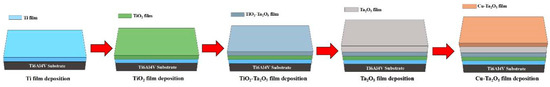 The substrates are silicon wafer (10 mm × 10 mm × 2 mm) and Ti6Al4V titanium alloy (10 mm × 10 mm × 0.6 mm). The composition of Ti6Al4V titanium alloy is Al, 6.8 wt %; V, 4.5 wt %; Fe, 0.3 wt %; O, 0.2 wt %; C, 0.1 wt %; N, 0.05 wt %; H, 0.015 wt %; and the surplus, Ti. Ta2O5, Ti and Cu target material (ZNNM., Beijing, China) have a size of Ø 75 mm × 4 mm and a purity of 99.99%. Argon is used as the working gas, oxygen as the reaction gas, their purity is 99.99%.