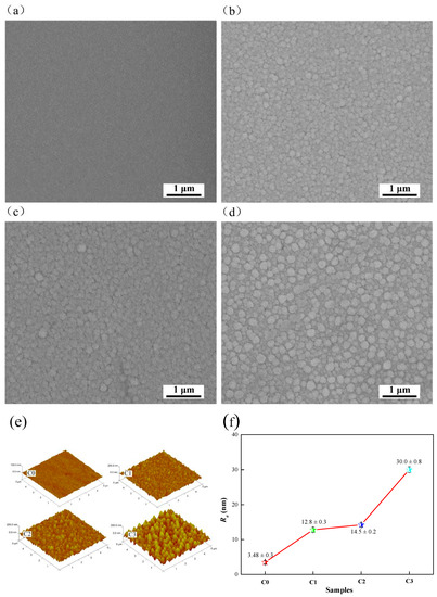 Scanning electron microscope (SEM) images: (a) C0, (b) C1, (c) C2 and (d) C3. (e) Atomic force microscope (AFM) images and (f) surface roughness.