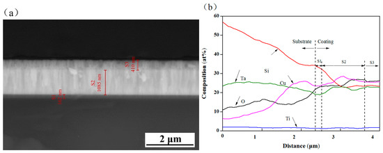 Figure 6 shows the SEM image and EDS line scan results of cross-section of C3 coating sample. In Figure 6a, there are three obvious layers S1, S2 and S3 in the coating section. According to the coating structure (Figure 1) and the expected thickness of the individual film layer, it can be concluded that S1, S2 and S3 layers can be assigned to Ti film, TiO2/TiO2-Ta2O5/Ta2O5 film and Cu-Ta2O5 film, respectively. In the S2 region, there is no obvious interface among TiO2 film, TiO2-Ta2O5 film and Ta2O5 film, and no micropores or cracks appear. The two layers are basically integrated, which helps to improve the adhesion of adjacent layers. Figure 6b shows that Ta, Cu, Ti and O are contained in all S1, S2 and S3 of the coating. Among them, the rising trends of the contents of O, Ta and Cu in the coating are observed, while the Ti element was relatively stable. The fluctuation of element content is related to the region of the film and its components. These elements are distributed throughout the coating and diffused into the substrate, which helps to improve the chemical affinity between adjacent film layers and form the metallurgical bonding interface for reducing interfacial stress and improving coating bonding strength.
