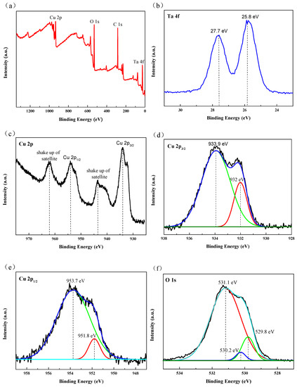 Figure 8 displays the XPS spectra of the C3 sample. The full XPS spectrum in Figure 8a shows the peaks of Cu 2p, O 1s and Ta 4f, indicating the presence of Cu, O and Ta on the surface of the C3 sample. In the high-resolution spectrum of Ta 4f (Figure 8b), two peaks located at the binding energy position of 25.8 eV and 27.7 eV correspond to the characteristic peaks of Ta 4f7/2 and Ta 4f5/2, respectively, indicating that the chemical state of Ta on the surface of C3 sample is Ta2O5 [17].