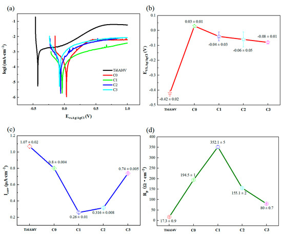 Potentiodynamic polarization curves (a) and corrosion parameters of coated and uncoated Ti6Al4V: (b) Ecorr, (c) Icorr, (d) Rp.