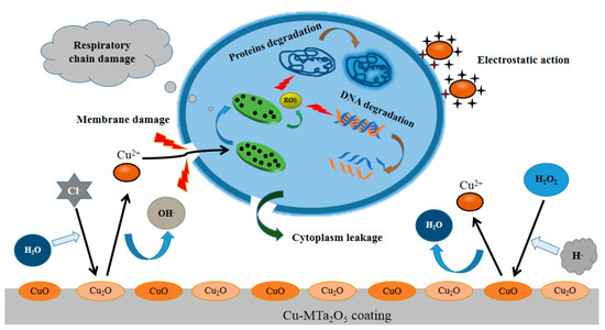 Schematic diagram of possible sterilization mechanism of Cu ions released by Cu-MTa2O5 coating.