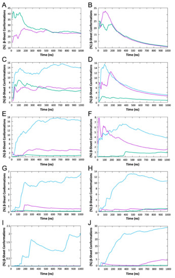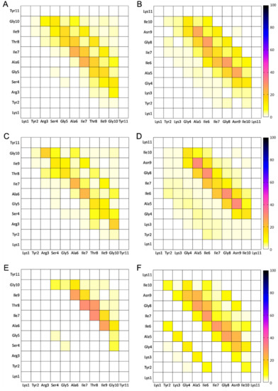 36], we calculated the solvent accessible surface area, i.e., the total accessible surface area ratio of residues at positions one, two, three, and eleven of the two central peptides in each highly ordered and well-aligned four-stranded antiparallel β-sheet structures. As the degree of solvent accessibility of the two outer peptides was artificially high due to the absence of interacting peptides on both sides, their values were not considered in the analysis. The total accessible surface areas were defined as the maximum solvent accessible surface area (SASA), which was the SASA of the set of residues with all other atoms removed, as in References [
