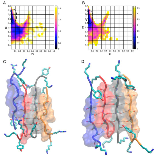 33] respectively. These parameters were shown to constitute effective reaction coordinates to construct free-energy landscapes through which the most highly ordered and well-aligned β-sheet conformations of amyloid peptides can be extracted from the simulations [