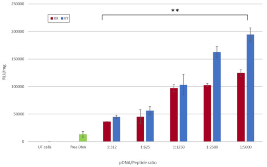76], and in part for the translocation through the negatively charged anionic phospholipids and/or for the neutralization of various charge factors on the cell surface. It is plausible to conclude that, as the negative charge of the complexes was reduced, the transduction efficiency increased, resulting in a direct correlation of the pDNA/peptide complex charge and the gene delivery efficacy. Furthermore, KY–DNA complexes achieved higher luciferase gene expression levels compared to KK–DNA complexes. This cannot be attributed solely to the difference in overall charge, since the zeta potential measurements fluctuated in the same levels. Arginine-containing sequences may have an advantage in rapid cell penetration due to the ability of the guanidine head to form bidentate hydrogen bonds with the negatively charged membrane constituents [
