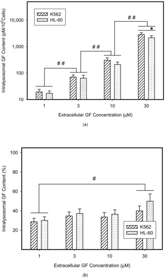 Therefore, we addressed the question of whether the increased lysosomal accumulation capacity of GF and IM was associated with lysosomal biogenesis since such effect was observed for various lysosomotropic drugs [24,37]. However, Western blot analysis of lysosomal marker genes, including LAMP1, LAMP2, and ATPGB2 (vacuolar ATPase subunit B2), indicated no change in their expression at protein level (Figure 2 and Figure 3). Similarly, lysosomal enzymes ACP, and GLB did not exhibit increased activity (Figure 4). In contrast, a decrease in ACP and GLB activity was observed for the highest concentrations of GF and IM in HL-60 and particularly in K562 cells (Figure 4). These results indicate that the increased lysosomal sequestration capacity can hardly be attributed to lysosomal biogenesis.