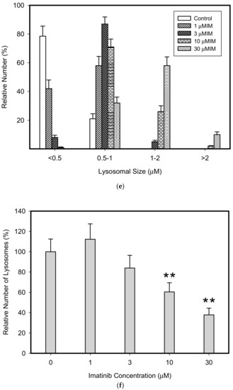 Effect of TKIs on lysosomal morphology in K562 cells. Cells were cultured for 6 h in the presence of particular TKI under standard conditions and then fixed in paraformaldehyde and subjected to the immunostaining of LAMP. Cells cultured in medium without TKIs were taken as a control. (a) Morphologic changes in lysosomes in IM treated cells (typical analysis). (b) Quantitative analysis of lysosomal size in IM treated cells. (c) Quantitative analysis of the number of lysosomes in IM treated cells. (d) Morphologic changes in lysosomes in GF treated cells (typical analysis). (e) Quantitative analysis of lysosomal size in GF treated cells. (f) Quantitative analysis of the number of lysosomes in GF treated cells. Lysosomal morphology was evaluated in at least 250 cells for each treatment. The results are represented as means of four independent experiments with standard deviations. ** denotes significant change in the relative number of lysosomes (p < 0.01) between TKI treated and control cells.