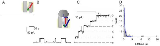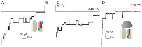 Ag/AgCl reference electrodes were immersed into the buffer solutions at both sides of the planar bilayers. The command electrode of the patch clamp amplifier (model EPC9, HEKA electronics, Chester, Canada) was dipped into the cis compartment and the ground electrode into the trans compartment. The recording filter for the transmembrane current was a 4-pole Bessel with −3 dB corner frequency of 0.1 kHz [19]. The raw data were analyzed using the TAC software package (Bruxton Corporation, Seattle, WA, USA). Gaussian filters of 12 Hz were applied to reduce noise. The data were then further processed using SigmaPlot (Systat Software Inc., San Jose, CA, USA).