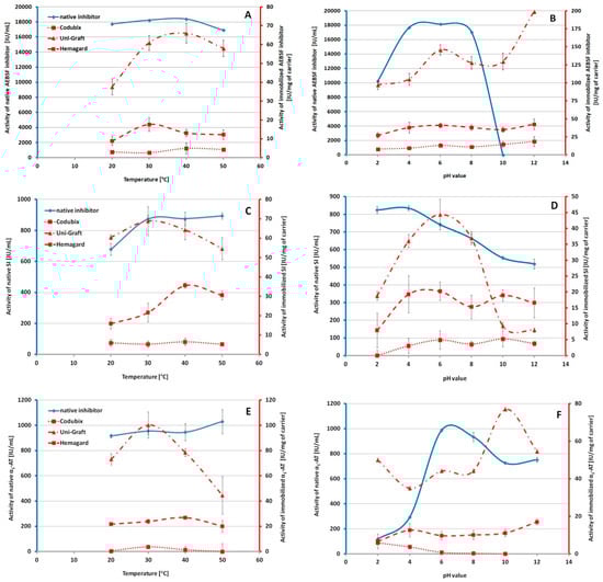 Inhibitor activity profiles after incubation in the environment with different values of temperature and pH—(A) and (B) AEBSF inhibitor; (C) and (D) SI; (E) and (F) α1-AT.