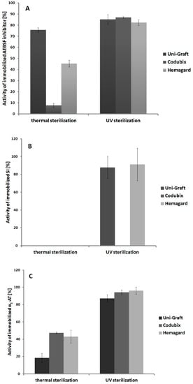 The UV-radiation sterilization caused a slight decrease in the inhibition activity of the AEBSF-modified biomaterials (Figure 2A). All of the tested variants retained over 80% of their activity. However, after thermal sterilization, there was a significant decrease in the activity of the AEBSF inhibitor immobilized on the surface of all biomaterials. The AEBSF-modified Codubix prosthesis was the most sensitive to thermal sterilization (7.6% of the initial activity), while AEBSF-modified Uni-Graft prosthesis was the most resistant (75.6% of the initial activity). Thermal sterilization of the SI-modified prostheses caused complete inactivation of their inhibitory properties (Figure 2B). A similar dependency was observed in the case of the SI-modified Codubix prosthesis treated with the UV sterilization. The UV sterilization of the α1-AT-modified prostheses did not cause a high decrease in their inhibitory activity (Figure 2C). All the preparations remained active in the range of 87.2–96.1% of the initial activity. However, a large decrease in the inhibition activity was noticed in the case of the thermally sterilized α1-AT-modified prosthesis samples. The modified Uni-Graft prosthesis was the most sensitive to this type of sterilization (21.1% of initial activity), whereas the modified Codubix prosthesis exhibited the lowest sensitivity (47.3%).