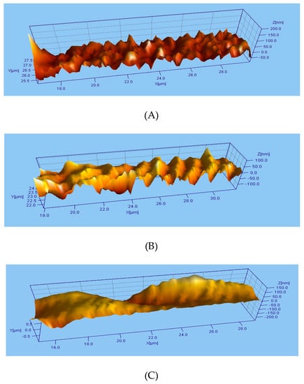Table 5 presents a summary of the average values of the studied parameters of the prosthesis structure (Table A1) with their standard deviations. Due to the high structural variability among the tested prostheses, we also performed a non-parametric Kruskal–Wallis test, which demonstrated that the three examined prostheses differ from each other in the Sds parameter (describing the number of elevations on the prosthesis surface in mm2) in a statistically significant manner (p <0.0001). Moreover, the analysis of the Ssc parameter did not confirm that the introduction of the covalent changes in the surface structure of the examined prostheses had a negative impact on their sensitivity to plastic deformation. The analysis of the AEBSF-modified Uni-Graft prosthesis images (Figure 5) indicates the presence of more structures with high protrusions number (Figure 5B). This type of modification resulted in an increase of the peaks height, which were presented on the biomaterial surface. An increase in amplitude between the highest and the lowest points on the surface of the prosthesis was also observed (data not showed). On the other hand, the covalent modifications of the structure of polymeric prostheses with a protein inhibitor lead to the smoothing of their surface (Figure 5C). The presence of immobilized α1-AT on the surface of the Uni-Graft prosthesis caused the disappearance of small peaks and increased homogeneity of the biomaterial surface.