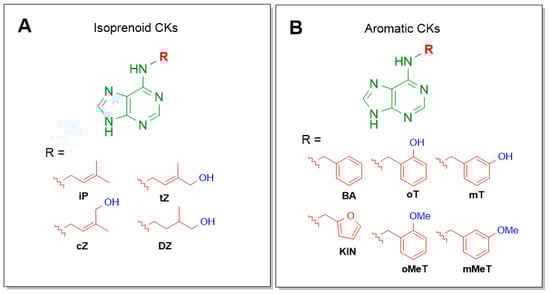 Names and structures of the naturally occurring cytokinins. (A) Isoprenoid (aliphatic) CKs: iP—N6-isopentenyladenine; cZ—cis-zeatin (N6-(4-hydroxy-3-methyl-cis-2-buten-1-yl)adenine); tZ—trans-zeatin (N6-(4-hydroxy-3-methyl-trans-2-buten-1-yl)adenine); DZ—dihydrozeatin (N6-(4-hydroxy-3-methyl-2-butan-1-yl)adenine); (B) Aromatic CKs: oT—ortho-topolin (N6-(2-hydroxybenzyl)adenine); mT—meta-topolin (N6-(3-hydroxybenzyl)adenine); oMeT—ortho-methoxytopolin (N6-(2-methoxybenzyl)adenine); mMeT—meta-methoxytopolin (N6-(3-methoxybenzyl)adenine); BA—N6-benzyladenine; KIN—kinetin (N6-furfuryladenine).
