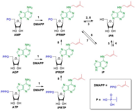 Scheme of the iP biosynthesis. (1)—isopentenyltransferase; (2)—5′-ribonucleotide phosphohydrolase (5′-nucleotidase); (3)—adenosine kinase; (4)—adenosine nucleosidase; (5)—purine nucleoside phosphorylase; (6)—phosphorybohydrolase (LOG); (7)—adenosine phosphoribosyltransferase; (8)—phosphatase.