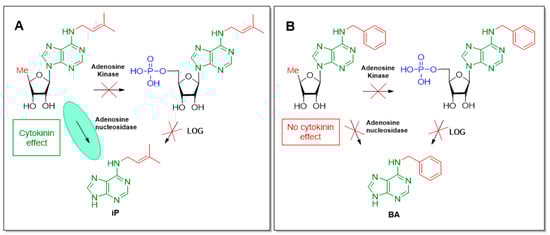 The effect of structural modification of cytokinin nucleosides in Arabidopsis on the biosynthesis pathways of iP (A) and BA (B).