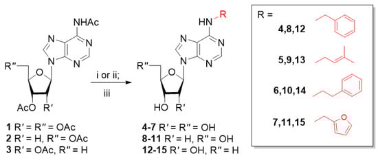 To synthesize desired nucleosides, we used our mild and efficient approach based on regioselective N6-alkylation of acetyl-protected adenosine, 2′-deoxyadenosine and 5′-deoxyadenosine derivatives 1-3 either with alcohols under Mitsunobu reaction conditions (Scheme 1, conditions (i)) or with alkyl halides in the presence of the base (Scheme 1, conditions (ii)) [13,14]. The main advantage of these approaches is the possibility to use both alkyl halides and alcohols for N6-modification. The following deacetylation with n-PrNH2 in MeOH (Scheme 1, conditions (iii)) yielded the final nucleosides with high overall yields. The initial triacetyl-5′-deoxyadenosine 3 was synthesized by radical reduction of corresponding 5′-chloro-5′-deoxyadenosine derivative in the presence of Bu3SnH according to the literature [21].