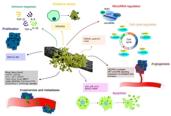 Indeed, anti-invasive and anti-migrative potential of lichens is related to the modulation of various signaling molecules such as members of Ras superfamily of small GTPases (RhoA, Rac1, Cdc42, and KITENIN) which play a significant role in tumor development and progression. In this regard, metastasis-related genes including CAPN1, CDC42, CFL1, IGF1, or WASF1 as well as epithelial–mesenchymal markers (Twist, Snail, Snug) might also be targets of lichens. On the other hand, anticancer effect of lichen realized through the angiogenesis inhibitory activities are related to the suppression of endothelial tube formation [35] or vascular endothelial growth factor receptor (VEGFR)-2-mediated Akt and extracellular signal-regulated kinase (ERK) signaling [29]. Current results showed that anticancer effects of lichens are also associated with the modulation of inflammatory responses via TNF-α, IL-1β, IL-6, and TGF-β1 [36] and with targeting of microRNA molecules [37].