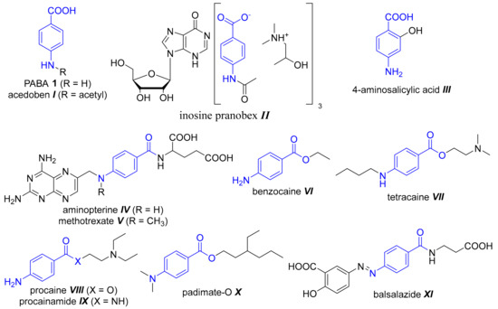 In medicinal chemistry, a PABA-building block is used in design of drugs frequently and this scaffold can be found in many drugs with various therapeutic effects (Figure 1). We can distinguish “simple” PABA-derived drugs substituted at carboxyl and/or amino group basically, or more complex molecules with an additional substitution of benzene ring. Focusing on the first group mentioned, the carboxyl can be free, in salt form, or modified through ester or amide bond formation. The amino group is usually free, mono- and di-alkylated or incorporated into amide. For example, PABA-based drugs summarized in Figure 1 involve anticancer and cytotoxic folate antagonists (e.g., aminopterin IV, methotrexate V), alkylating agents, local anaesthetics (benzocaine VI, tetracaine VII, procaine VIII, etc.), antiarrhythmics (procainamide IX), sunscreens (Padimate-O X) or anti-inflammatory drugs (balsalazide XI) [12].