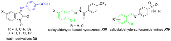 Our present approach is focused on the synthesis of Schiff bases of PABA and aldehydes, mainly salicylaldehydes, and their evaluation as potential antimicrobial and cytotoxic agents. These fused compounds combine two pharmacophores through the imine bond. Previously, we have applied molecular hybridization approach successfully. Illustratively, salicylaldehyde-based imines and hydrazones derived from known bioactive scaffolds (Figure 2, XIII–XIV) have exhibited a significant antimicrobial activity [19,20,21]. We have described that a potent antimicrobial activity is associated only with the salicylidene moiety and its isomers are substantially less active [21,22]. That is why we designed predominantly 2-substituted benzylidene scaffold for this study. The modification of the amino group can result in altered vitamin function in susceptible strains and novel derivatives with an enhanced lipophilicity may promote limited absorption and intracellular accumulation of PABA via passive diffusion.
