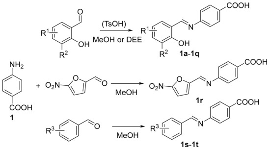 Synthesis of PABA-based imines 1a–1t (R1 = H, 5-F, 4-Cl, 5-Cl, 6-Cl, 5-Br, 5-I, 5-NO2, 5-CH3, 5-OCH3, 5-OH, 5-t-Bu; R2 = H, Cl, Br, I; R3 = 2-OCH3, 4-OH; TsOH = toluene-4-sulfonic acid; DEE = diethyl ether).