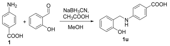 4-aminobenzoic acid (137.1 mg; 1 mmol) was dissolved in 7 mL of MeOH, followed by addition of salicylaldehyde (117 µL; 1.1 mmol), sodium cyanoborohydride (62.8 mg; 1 mmol) and finally glacial acetic acid (100 µL). The mixture was stirred for 24 h at room temperature. After this time, the reaction mixture was diluted with distilled water and stirred for additional 1 h. The resulted precipitate was filtered off and washed by water. The product was crystallized from ethyl acetate/n-hexane to obtain pure 1u.