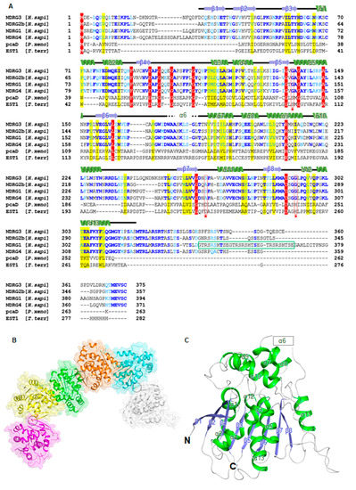 - Shaw, E.; McCue, L.A.; Lawrence, C.E.; Dordick, J.S. Identification of a novel class in the alpha/beta hydrolase fold superfamily: The N-myc differentiation-related proteins. Proteins 2002, 47, 163–168. [Google Scholar] [CrossRef]