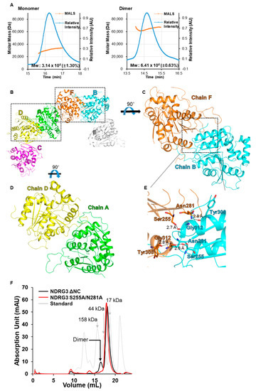 Dimeric interactions of NDRG3 ΔNC. (A) SEC-MALS analyses of the NDRG3 ΔNC monomer and dimer. The blue line indicates the relative absorbance of protein during size-exclusion chromatography, and the orange line represents the mass of the molecules analyzed by MALS. (B) A hexamer structure of NDRG3 ΔNC in an asymmetric unit (ASU). Each NDRG3 ΔNC structure is represented as a cartoon model in different colors and chain numbers are denoted as letters with the same color. (C) Dimeric interactions of chain B and chain F in an ASU. (D) Dimeric interactions of chain A and chain D in an ASU. (E) A close-up view of hydrogen bonds between chain B and chain F. Residues involved in hydrogen bonding were shown in stick models with labels. (F) Chromatograms of NDRG3 ΔNC and S255A/N281A from analytical size exclusion chromatography. The grey chromatogram indicates a gel filtration standard profile (Bio-Rad #1511901, Hercules, CA, USA).