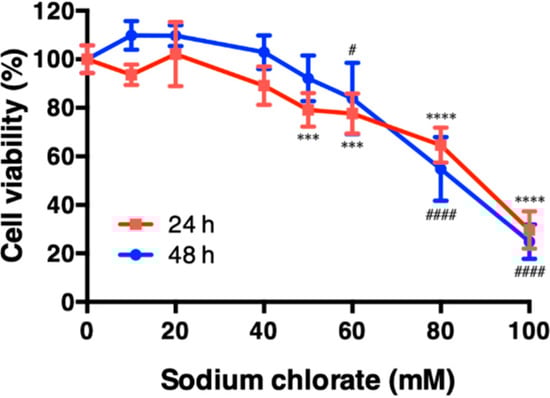 Effect of sodium chlorate on cell viability. HT22 cells were treated with the indicated concentrations of sodium chlorate for 24 h (red line) or 48 h (blue line) and cell viability was measured by WST-1 assay. The data are presented as the means ± SD of at least six independent cultures. *** p < 0.001, **** p < 0.0001 compared with the 24 h control; # p < 0.05, #### p < 0.0001 compared with the 48-h control.
