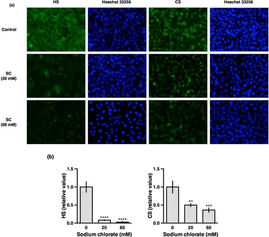 Effect of sodium chlorate on HS and CS in HT22 cells. (a) Representative fluorescence micrographs of typical data shown. HT22 cells were cultured with or without sodium chlorate (20 or 60 mM) for 24 h and subjected to immunofluorescent staining. HT22 cells were stained with 10E4 (anti-HS antibody) and CS-56 (anti-CS antibody). (b) Fluorescence intensity was quantified using a Keyence image measurement and analyzing software (VH-H1A5; Keyence). The data are presented as the mean ± SD (n = 4). ** p < 0.01, *** p < 0.001, **** p < 0.0001 compared with the control.