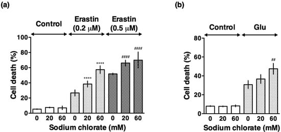 Sodium chlorate enhanced endogenous oxidative stress-induced cell death in HT22 cells. (a) Effect of sodium chlorate on erastin-induced cell death. HT22 cells were treated with 0.2 µM or 0.5 µM erastin in the presence or absence of sodium chlorate (20 or 60 mM) for 24 h and cell death was determined by LDH assay. (b) Effect of sodium chlorate on glutamate-induced cell death. HT22 cells were treated with 5 mM glutamate in the presence or absence of sodium chlorate (20 or 60 mM) for 24 h and cell death was determined by LDH assay. The data are presented as the mean ± SD. The data were obtained from at least four independent cultures. **** p < 0.0001, #### p < 0.0001 compared with 0.2 µM or 0.5 µM erastin alone; ## p < 0.01 compared with glutamate alone.