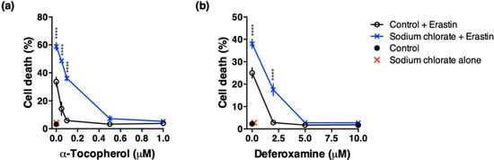 Several studies have reported that ROS scavenging and iron chelating chemicals such as α-tocopherol and deferoxamine prevent glutamate- or erastin-induced cell death in HT22 cells [,,]. We examined whether ROS scavenging and iron chelating chemicals mitigated enhanced toxicity of sodium chlorate. Cotreatment with α-tocopherol (1 µM) completely suppressed erastin-induced cell death irrespective of the presence or absence of sodium chlorate. In contrast, the protective effect of α-tocopherol (0.1 µM or less) weakened significantly in the presence of sodium chlorate (Figure 6a). Similarly, deferoxamine (5 µM or more) completely suppressed erastin-induced cell death, however, deferoxamine (2 µM) only partially prevented enhanced toxicity of sodium chlorate (Figure 6b). These results indicate that increased ROS and Fe2+ are involved in sodium chlorate-enhanced ferroptotic cell death.