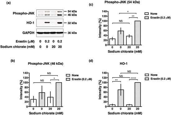 Oxidative stress directly or indirectly contributes to ROS-mediated various intracellular signaling pathway. ROS activates the Nrf2-antioxidant response element (ARE) pathway, an indicator and modulator of oxidative stress in neurodegeneration [] that induces the expression of downstream target genes, such as hemoxygenase-1 (HO-1). ROS also induces phosphorylation of the stress kinase JNK which is involved in cellular responses to environmental stresses. We investigated whether sodium chlorate affected these intracellular signaling pathways in response to oxidative stress. Consistent with the previous reports [], phosphorylation of JNK was increased upon the treatment with erastin and this induced phosphorylation was further enhanced by sodium chlorate (Figure 7a–c). In contrast, the erastin-induced increase in HO-1 expression was not changed significantly by treatment with sodium chlorate (Figure 7a,d). These results suggest that the activation of the JNK pathway is involved in reduced-sulfation enhanced oxidative stress, whereas the Nrf2-ARE pathway is not influenced by reduced sulfation in the cells.