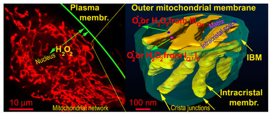 Figure 1. Representation of distances for hypothetic H2O2 diffusion to plasma membrane — demonstrated on a confocal image of the mitochondrial network (left) and FIB/SEM 3D image of cristae within a segment of the mitochondrial network (oriented vertically). The arrows show diffusion distances from the most proximal and most distant tubule of the mitochondrial network to the plasma membrane (left) and diffusion from the matrix (translucent space inside the IBM cylinder) or from then intracristal space (yellow topology, which also comprises ATP synthase oligomers and respiratory chain supercomplexes).